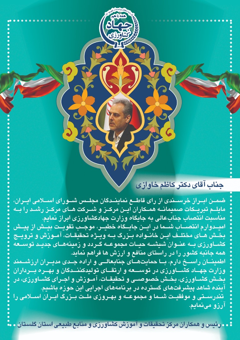 ضمن ابراز خرسندی از رای قاطع نمایندگان مجلس شورای اسلامی ایران، مایلم تبریکات صمیمانه همکاران این مرکز را به مناسبت انتصاب جنابعالی به جایگاه وزارت جهادکشاورزی ابراز نمایم.