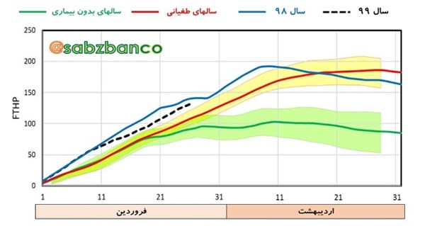 به گزارش روابط عمومی و امور بین الملل مرکز تحقیقات و آموزش کشاورزی و منابع طبیعی استان گلستان، دکتر محمدعلی آقاجانی معاون آموزشی و عضو هیات علمی بخش تحقیقات گیاهپزشکی مرکز تحقیقات و آموزش کشاورزی و منابع طبیعی استان گلستان در این خصوص گفت: نمودار تجمعی متغیر پیشگوی FTHP از ابتدای سال ۹۹ و مقایسه‌ی آن با نمودار سال‌های بدون بیماری و دارای بیماری و سال ۹۸ نشان می‌دهد که تقریباً به وضعیت مشابه طغیان بیماری در سال گذشته رسیده‌ایم. همچنان وضعیت متغیر پیشگوی بیماری  بالاتر از منحنی سال‌های دارای بیماری (محدوده‌ی زرد رنگ و خط قرمز رنگ) است، و این می‌تواند هشداری برای وقوع طغیانی بیماری در روزهای آتی باشد. لازم به ذکر است که نخستین علایم بیماری در روز ۹۹/۰۱/۱۷ در رقم حساس اسپرینت مشاهده شده است.