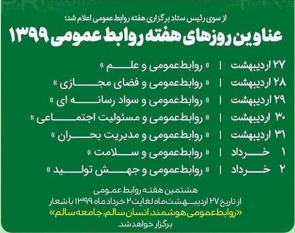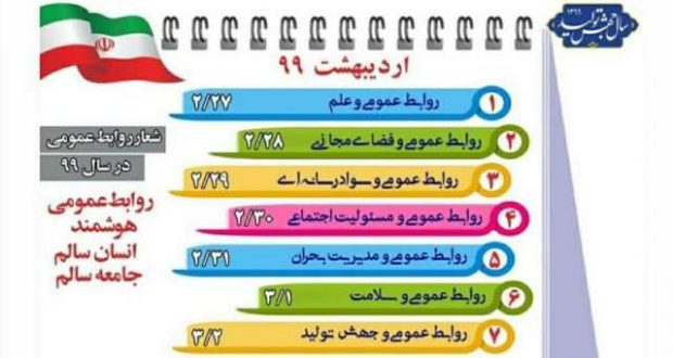 عناوین روزهای هفته روابط عمومی که از تاریخ ۲۷ اردیبهشتماه تا ۲ خرداد سالجاری در سراسر کشور برگزار میشود، اعلام شد.