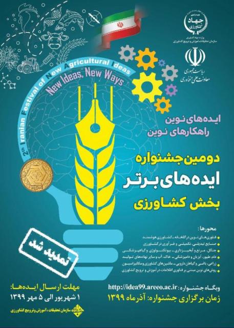 به اطلاع کلیه مخترعین، نوآوران، ایده پردازان و فناوران بخش کشاورزی می رساند که با توجه به استقبال زیاد متقاضیان و همچنین درخواست آنها برای تمدید مهلت ارسال ایده ها، فناوری ها و اختراعات،  دبیرخانه “دومین جشنواره ایده های برتر بخش کشاورزی مهلت دریافت آثار را  تا ۵ مهرماه ۱۳۹۹ تمدید نمود. لذا خواهشمند است آثار (ایده، اختراع، دانش فنی، فناوری و …)خود در محورهای اشاره شده را حداکثر تا ۵ مهرماه به دبیرخانه جشنواره ارسال فرمایید می باشد. با توجه به محدودیت زمانی، تسریع در ارسال آثار مورد امتنان خواهد بود.