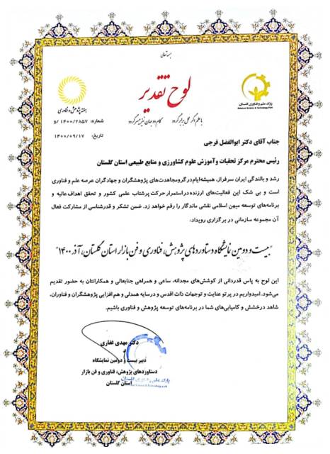 در آیین پایانی نمایشگاه هفته پژوهش وفناوری استان، با توجه به این حضور فعال و ارایه دستاوردهای ارزشمند پژوهشی این مرکز، از دکتر ابوالفضل فرجی رییس مرکز تحقیقات و آموزش کشاورزی و منابع طبیعی استان گلستان با اهدای لوح یادبود تقدیر شد.