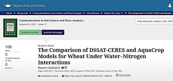 در این مقاله آمده است هر دو مدل توانایی شبیه سازی عملکرد و اجزای عملکرد گندم را در تیمارهای مختلف آب و کود دارند، اما مدل AquaCrop با توجه به داده های مورد نیاز کمتر می تواند در شرایط کمبود داده، کارآیی بیشتری داشته باشد. این مقاله در شماره ۵۲ سال (۲۰۲۱)، مجله Communications in Soil Science and Plant Analysis با ایمپکت فاکتور (IF): ۱.۳۲۷ به صورت آنلاین منتشر شده است.