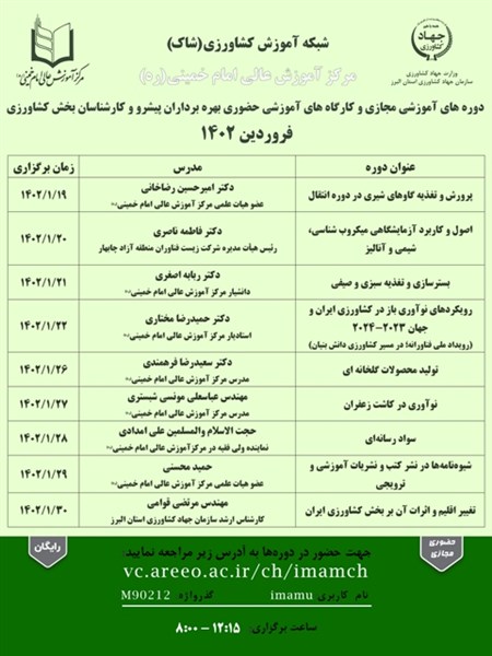 اطلاع رسانی دوره ها و کارگاه های آموزشی فروردین ۱۴۰۲ مرکز آموزش عالی امام خمینی (ره) M90212 : واژه گذر imamu :کاربری نام vc.aareeo.ac.ir/ch/imamch :کانال 1402-01-22 مدیریت سایت