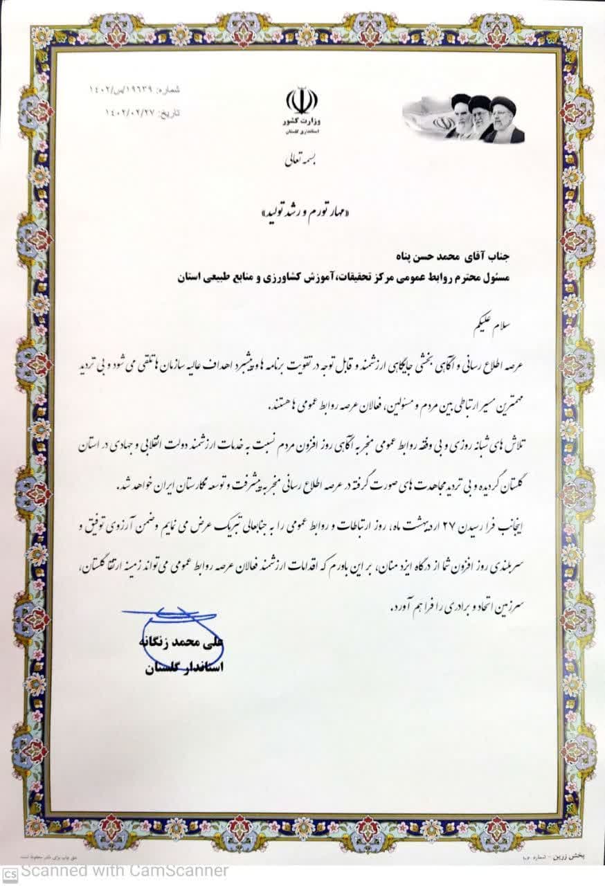 دکتر علی محمد زنگانه استاندار گلستان از مهندس محمد حسن پناه مسول روابط عمومی مرکز تحقیقات و آموزش کشاورزی و منابع طبیعی استان گلستان تقدیر کرد.