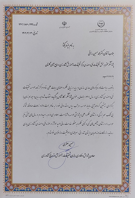 دکتر محمد حسین رزاقی پژوهشگر بخش تحقیقات فنی و مهندسی کشاورزی مرکز تحقیقات و آموزش کشاورزی و منابع طبیعی استان گلستان بعنوان محقق برتر سال موسسه تحقیقات فنی و مهندسی کشاورزی کشور انتخاب و تجلیل شد.