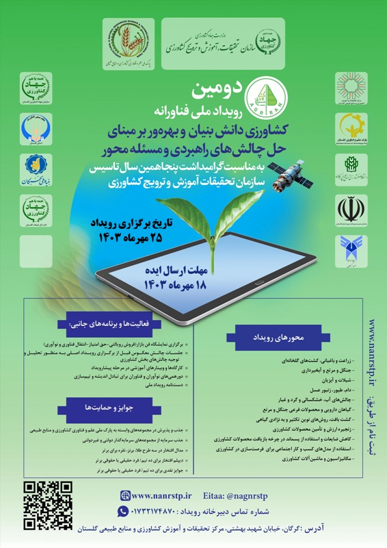 دومین رویداد ملی فناورانه کشاورزی دانش بنیان و بهره ور بر مبنای حل چالش های راهبردی و مسئله محور site: http://www.nanrstp.ir/home.axd راهنمای ثبت نام: Registration guide آیین نامه اجرایی رویداد استارتاپ ویکند پارک ملی علم وفناوری کشاورزی ومنابع طبیعی Event regulations 1403-05-15 مدیریت سایت