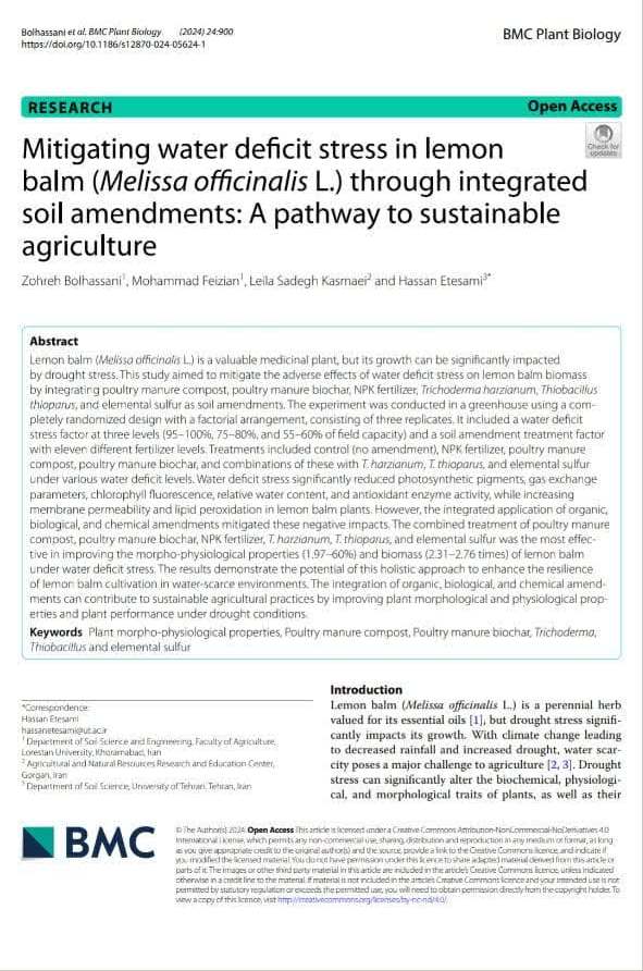 به گزارش روابط عمومی و امور بینالملل مرکز تحقیقات و آموزش کشاورزی و منابع طبیعی استان گلستان، این مطالعه با هدف کاهش اثرات نامطلوب تنش کمآبی بر عملکرد بادرنجبویه، با استفاده از کمپوست مرغی غنی شده با گوگرد، بیوچار و میکروارگانیسمهای مفید خاکزی به عنوان اصلاحکنندههای خاک انجام شد. اثبات تاثیر مثبت اصلاح کنندههای الی و زیستی مذکور بر مقاومت بادرنجبویه در برابر خشکسالی مهمترین دست اورد مطالعه مذکور میباشد. نتایج این مطالعه نشان داد که این روش تلفیقی باعث بهبود پارامترهای فیزیولوژیکی گیاه مانند رنگدانههای فتوسنتزی و فعالیت آنزیمهای آنتیاکسیدانی در گیاه در شرایط تنش خشکی شده است. نتایج این مطالعه تاییدی بر این امر است که با استفاده از روشهای تلفیقی میتوان به کشاورزی پایدار دست یافت و در عین حال عملکرد محصولات را افزایش داد.