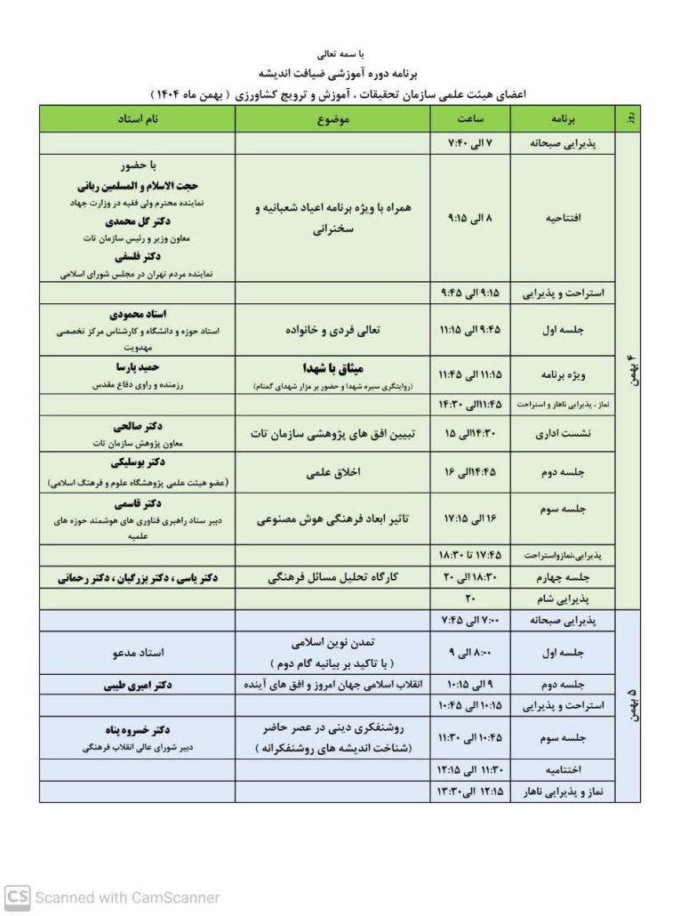 به گزارش روابط‌عمومی مرکز تحقیقات و آموزش کشاورزی و منابع طبیعی استان گلستان، گروهی از اعضای هیات علمی این مرکز، آیدینگ کرنژادی، سعید شعبانی و بهروز محسنی از بخش تحقیقات منابع طبیعی، در دوره معرفت‌افزایی کشوری «ضیافت اندیشه» ویژه اعضای هیات علمی سازمان تحقیقات، آموزش و ترویج کشاورزی (تات) که در مرکز آموزش عالی امام خمینی (ره) برگزار شد، شرکت کردند.